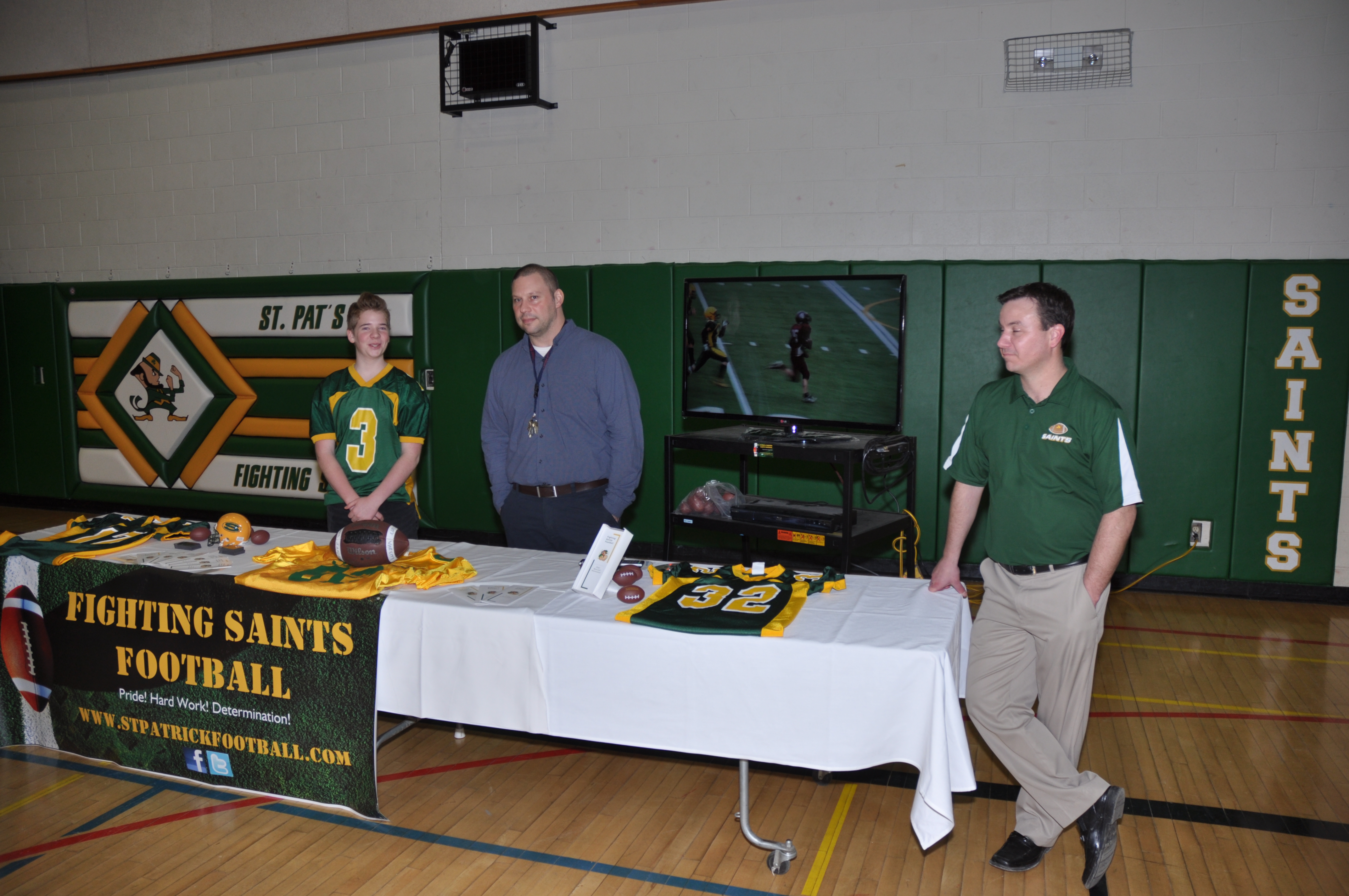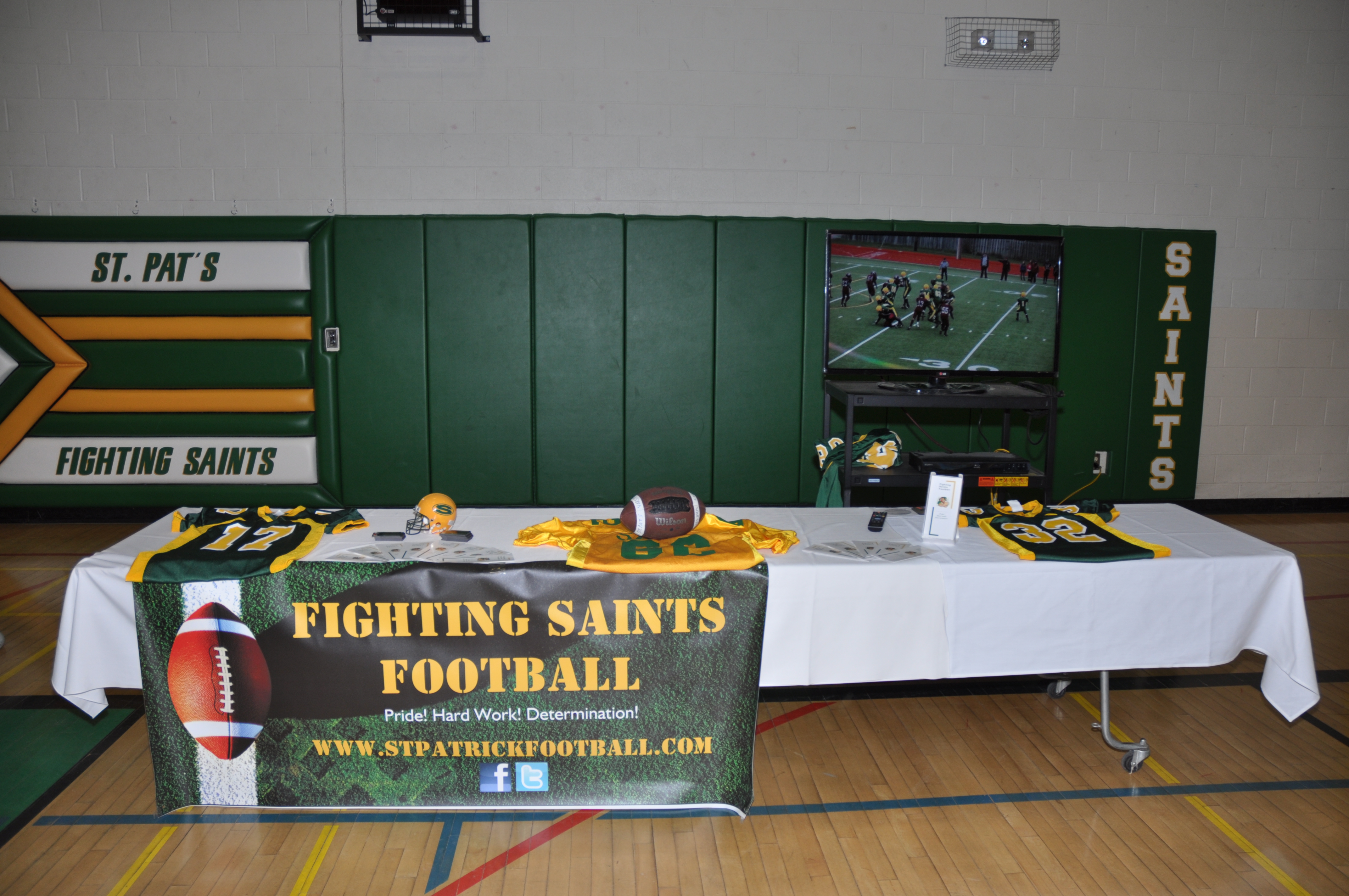 On February 12th St. Patrick High School hosted its annual open house for Grade 8 students. Fighting Saints Football was well represented as usual, this time with its own separate booth. Junior coaches Honeysett and Bevilacqua, along with Senior Head Coach Marcon manned the display. Joining them as well was junior player Xander Scriver. It was a very successful evening with a number potential recruits stopping by to learn more football at St. Patrick.